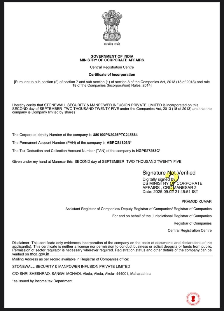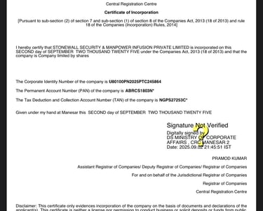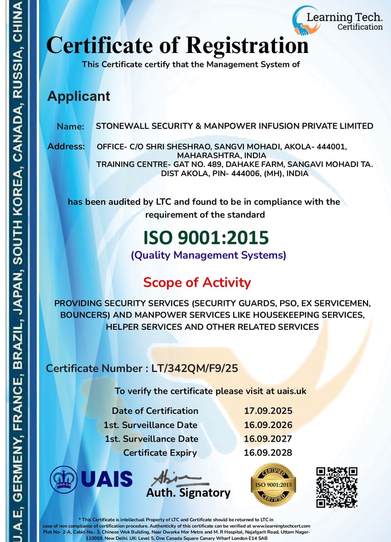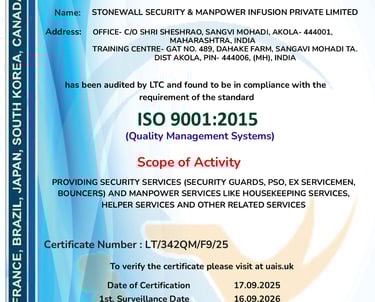 At STONEWALL SECURITY & MANPOWER INFUSION PRIVATE LIMITED, we combine trust, professionalism, and quality to deliver reliable security and manpower solutions. As a government-registered company (CIN: U80100PN2025PTC245864) and ISO 9001:2015 certified, we ensure the highest standards of service.